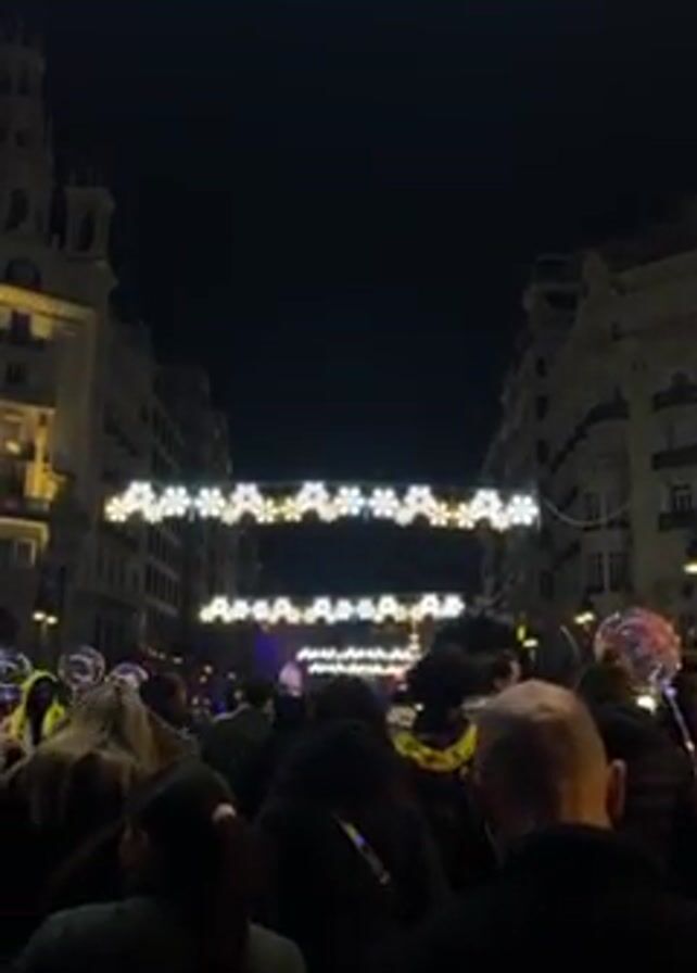 crowded street scene at night. The street is decorated with strings of white and gold lights hanging above the crowd. Tall buildings line both sides of the street. People are walking in the same direction, some carrying balloons. The overall atmosphere is festive.