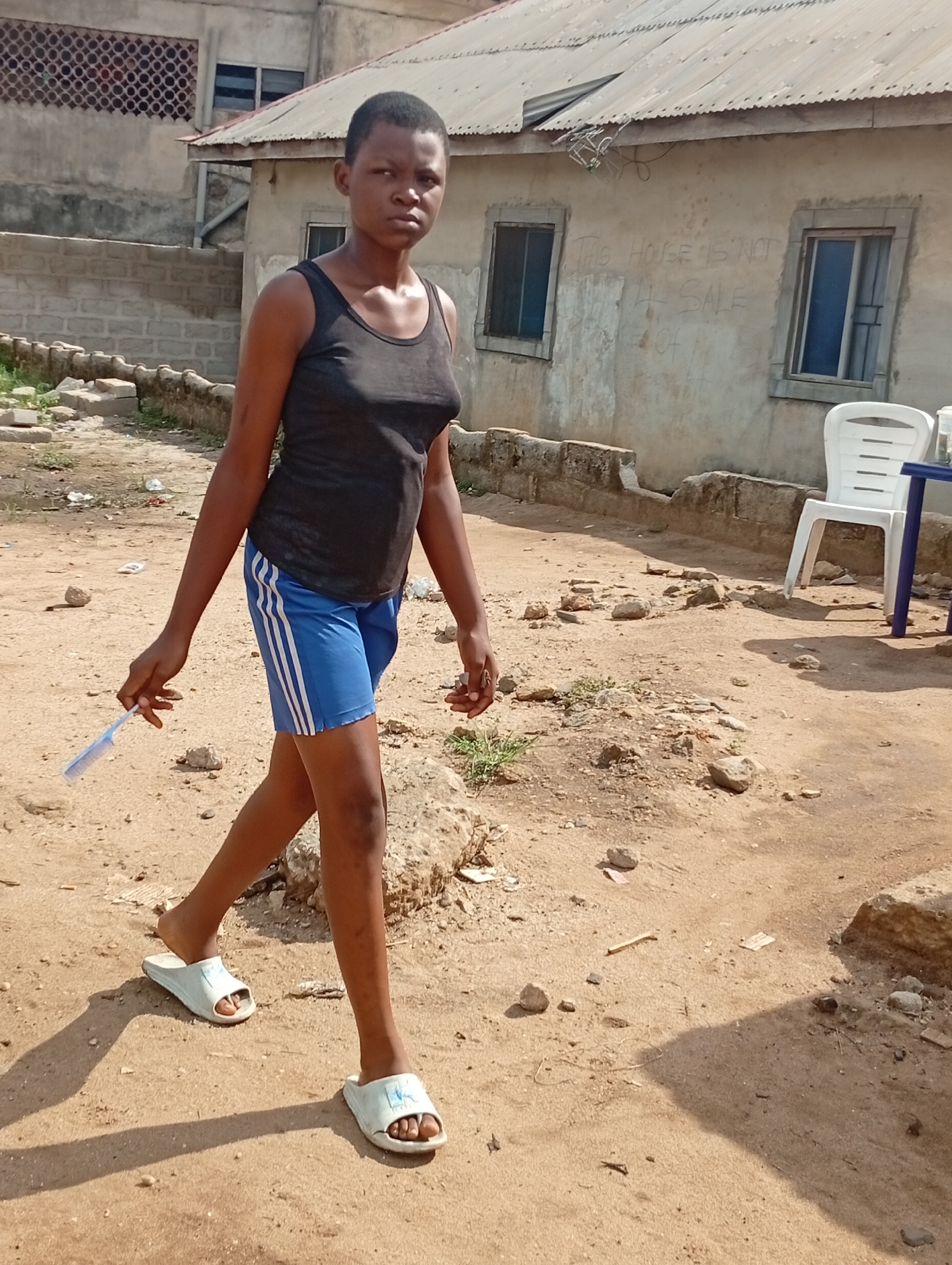 A young, dark-skinned individual walks across a sandy, uneven terrain. They are wearing a black tank top, blue shorts with white stripes, and white sandals. They are holding a blue comb in their right hand. The background features a building with faded walls and two windows. A white plastic chair is visible near the building. The inscription "THIS HOUSE IS NOT FOR SALE" is visible on the building's wall. The location is suspected to be in Owerri, Nigeria, based on visual characteristics and contextual clues.