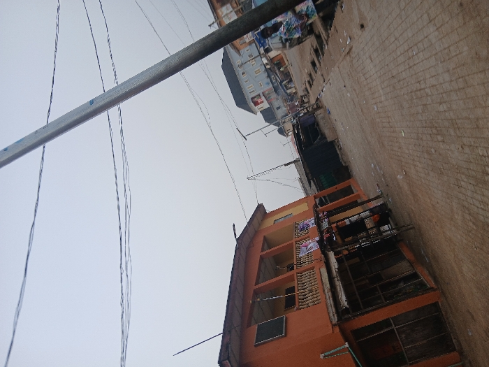 An outdoor shot features a narrow street flanked by buildings. The street is paved with rectangular blocks. On one side, a peach-colored multi-story building with dark windows and open balconies is prominent. Further down the street, taller gray buildings can be seen. Overhead, a horizontal metallic pole cuts across the frame, with electrical wires extending downward. The sky is overcast.