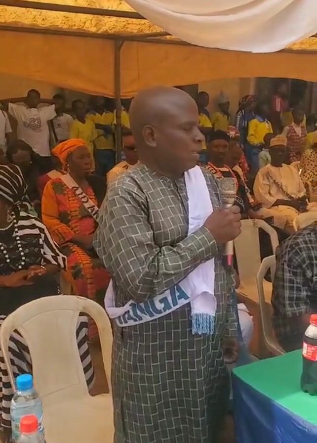 An outdoor political rally is underway in a large tent. The crowd consists primarily of adults of African descent. A bald man wearing a grey-green patterned robe and a sash that says “AJANGA” is speaking into a microphone. He stands behind a table with two bottles of Coca-cola, two bottles of water, a thermos, and flowers in a vase. A portion of the crowd is seated. People in the rear of the crowd are standing. The tent is draped with a white tarpaulin.