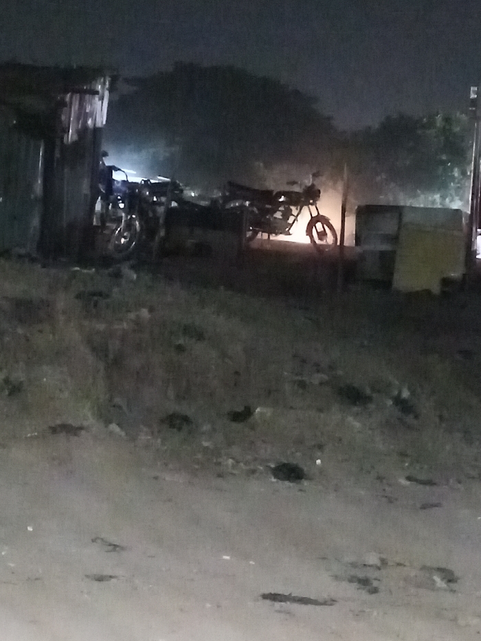 This forensic image captures a dimly lit, nighttime outdoor scene in Lugbe, Nigeria. The foreground consists of unpaved, uneven ground with scattered dark debris and sparse, low-lying vegetation. In the mid-ground, a structure constructed from corrugated metal sheets is visible on the left. Adjacent to this structure, a motorcycle is partially visible. Centrally positioned in the mid-ground, a second motorcycle stands upright, silhouetted against a bright, localized light source emanating from behind it. To the right of this central motorcycle, several indistinct rectangular objects or structures are present. The background is characterized by dense, dark foliage under an overcast or very dark sky, with additional faint light sources visible in the distance. No individuals are present in the frame, and no discernible actions or interactions are occurring.