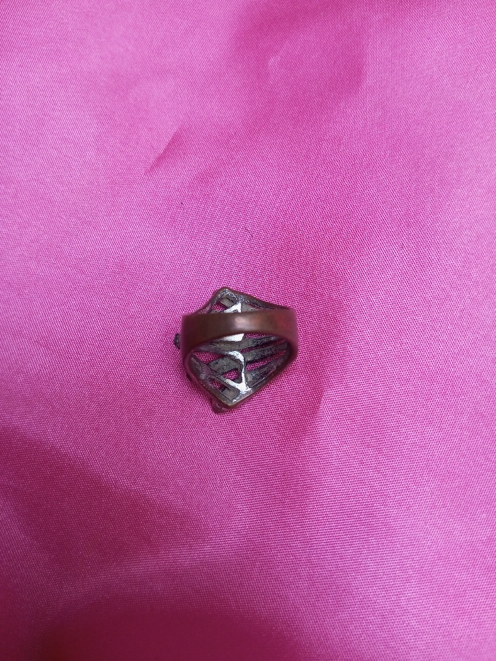A single metallic ring is depicted resting on a fuchsia-pink fabric surface. The ring features a broad, reddish-brown metallic band. Attached to this band is a decorative, openwork element made of a lighter, silver-toned metal. This decorative component is approximately diamond-shaped, characterized by a geometric, lattice-like pattern of cutouts. The ring's metallic surfaces exhibit visible wear, scratches, and areas of discoloration consistent with tarnish. The fabric background shows slight creases and variations in texture. No other objects or individuals are present. The location is Qarabucaq qəsəbə, Azerbaijan.