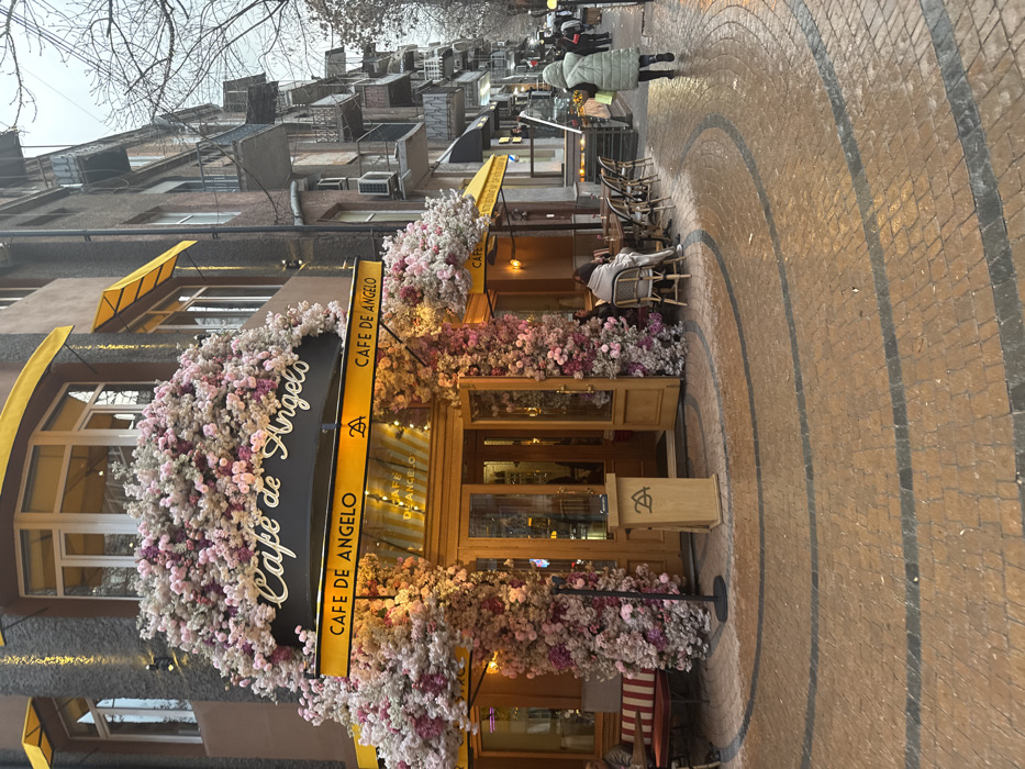 The image displays the exterior of "Cafe de Angelo" located at 31 Abovyan Street in Yerevan, Armenia. The cafe occupies a corner building, distinguished by an extensive decorative covering of artificial flowers in predominantly pink, white, and purple hues across its facade, entrance archway, and upper windows. Multiple yellow awnings extend from the building, covering outdoor seating areas. Above the main entrance, a black sign in script reads "Cafe de Angelo," beneath which a yellow banner repeats "CAFE DE ANGELO" with a stylized 'ZA' logo. The cafe's main entrance features open double wooden doors, with a light-colored wooden host stand bearing the 'ZA' logo positioned directly in front. To the right of the entrance, an outdoor dining area is visible with several small tables and wicker chairs. Two individuals are seated at one of these tables. To the left of the entrance, a red and white striped bench is present, with one person partially visible seated on it. The ground area immediately in front of the cafe is paved with reddish-brown cobblestones arranged in concentric patterns, segmented by dark gray lines; the surface appears damp. A pedestrian wearing a light green hooded puffer coat and carrying a light-colored bag is walking away from the cafe on this cobblestone path. In the background, multi-story urban buildings with balconies and external air conditioning units line the street under an overcast sky. Bare tree branches are visible on the right side of the frame, indicating a non-leafy season. Distant figures and commercial establishments are faintly visible further down the street.