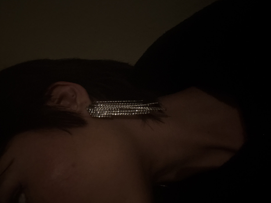 A close-up shot features a person's ear adorned with a cascading crystal earring. The earring drapes over the shoulder, catching a hint of light. The person's neck and upper back are partially visible, emerging from a dark background, where black fabric adds a contrast. The skin tone appears to be neutral. The overall composition is intimate and focuses on the sparkling accessory and the person's features.