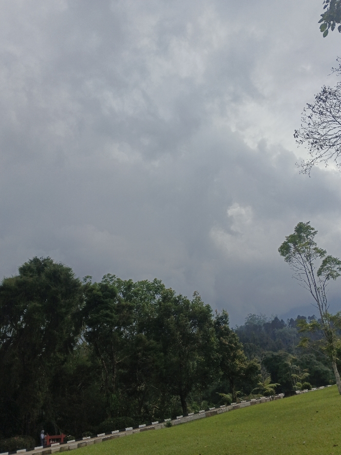 The scene depicts an outdoor landscape in Kwekwe, Zimbabwe, under a heavily overcast sky dominated by dense, grey clouds. In the foreground, a vibrant green, manicured grass lawn slopes gently upwards from left to right. A paved border, featuring alternating black and white rectangular segments, delineates the upper edge of the lawn, running horizontally across the image. Immediately behind this border, a dense line of various trees with dark green foliage extends across the midground. Further into the background, additional layers of trees form a continuous forest, with distant, tree-covered hills or mountains partially obscured by atmospheric haze. On the far left of the image, positioned behind the paved border and partially obscured by foliage, a red park bench is visible. Two individuals are present near this bench: one figure stands upright, partially hidden, wearing a light-colored upper garment and dark lower garment; another figure is seated on the red bench, dressed in dark attire, also partially obscured. No distinct actions or interactions are discernible between the individuals or with their immediate environment.