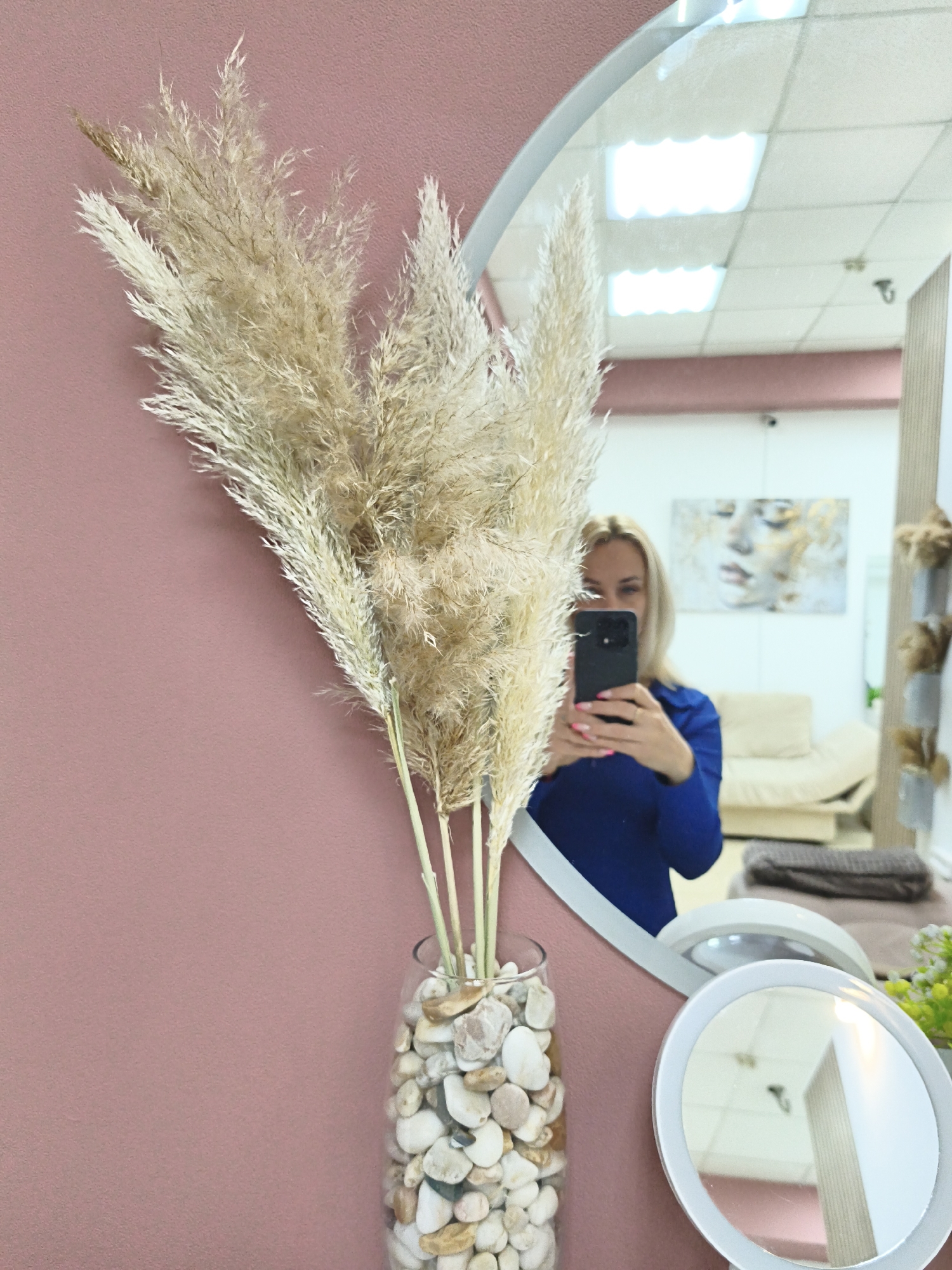 The scene is set in an interior location within Sevastopol, Ukraine, characterized by a pink-mauve wall on the left and a large, vertically oriented, rounded-top mirror on the right. In the foreground, against the pink wall, a clear glass vase filled with an assortment of white and light-colored pebbles holds a prominent arrangement of dried pampas grass, distinguished by its feathery, light-beige plumes. The large mirror reflects a blonde woman, positioned centrally, wearing a blue long-sleeved top. She is actively taking a selfie, holding a black smartphone with a dark case in both hands, with her pink-painted fingernails visible. Her eyes are visible above the phone. The mirror's reflection reveals further details of the room: a white acoustic tile ceiling with multiple rectangular fluorescent light fixtures provides illumination. Behind the woman's reflection, on a wall, a horizontal framed artwork depicts a stylized human face in light tones with gold accents. Below this, a light-colored, possibly beige or cream, recliner or sofa is visible. On a surface in the lower right portion of the mirror's reflection, a smaller, round cosmetic mirror with a light-colored rim stands next to a small green decorative plant. A dark brown folded item, possibly a towel or blanket, rests on a surface in front of the reflected sofa. The wall reflected behind the sofa appears light cream or white.