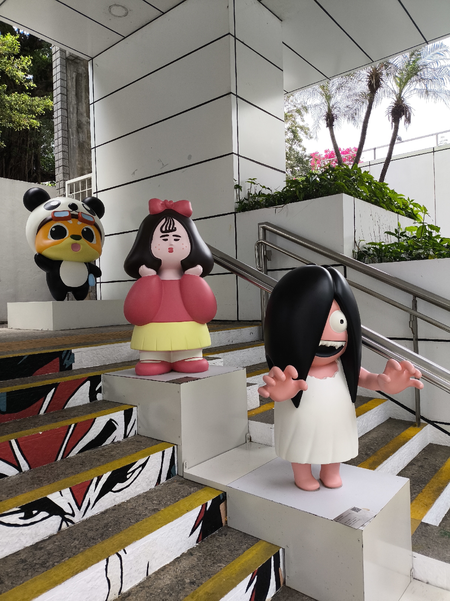 three cartoonish statues on a staircase, likely in an urban setting. The staircase is painted with abstract black, white, and red patterns. The statues, from left to right, depict: 1. A panda-like character wearing goggles. 2. A girl with a red bow in her hair, wearing a red and yellow dress. 3. A figure resembling Sadako from "The Ring," with long black hair covering its face, wearing a white dress. The background includes a white building with horizontal lines, greenery in planters, a metal handrail, and palm trees in the distance. The location is Hong Kong, China.
