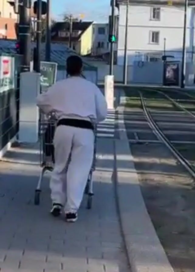 A person wearing a white sweatshirt, light gray baggy pants, black shoes and a black belt is pushing a metal shopping cart along a sidewalk in an urban setting. The sidewalk is made of gray bricks and has a slightly raised concrete border next to tram tracks. The cart appears to contain dark-colored bags or objects. Behind the person are buildings of different architectural styles, including a white three-story building with a triangular roof. A black sign with a colored logo is visible on the left. The sky is blue, and the sun is shining. Cars are visible in the distance.
