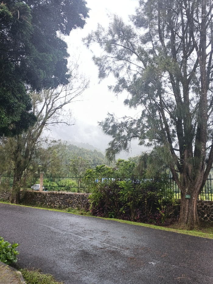 The image depicts a wet asphalt road in Matopos, Zimbabwe, under an overcast sky with visible mist or low clouds obscuring distant hills. The road, exhibiting scattered wet patches and a dark, damp appearance, occupies the lower portion of the frame. To the left, a large, dark green coniferous tree canopy is partially visible, alongside a thinner tree with sparse, light-colored foliage. On the right, a tall tree with a robust, textured trunk and drooping, needle-like green foliage stands next to the road; a small, rectangular green plaque is affixed to its trunk. Behind the road, a low stone wall supports a black metal fence. Beyond this fence, dense green and reddish-purple bushes are present, with a partial blue object or structure discernible among them. The background consists of densely forested hills, their upper sections softened by a light gray haze, suggesting mist or low clouds. No individuals, animals, or vehicles are present in the scene.