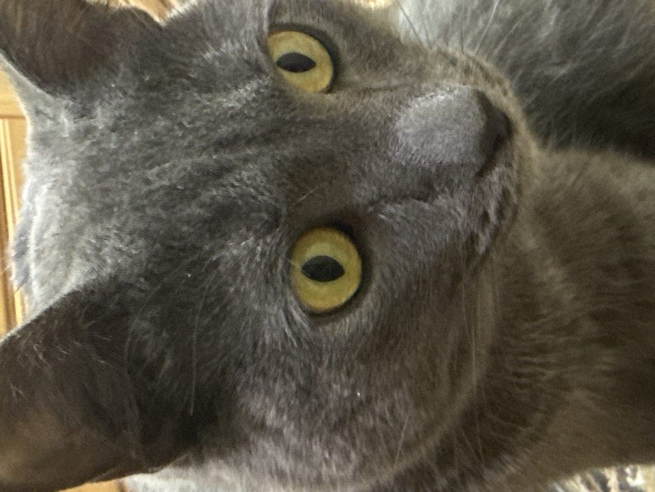 A close-up image depicts a domestic cat in an indoor setting within Прикамский, Russia. The animal is a solid grey short-haired cat, consistent with breeds such as a Russian Blue. Its prominent golden-yellow eyes feature dark, vertically elongated pupils, indicating an alert state. The cat's dark grey nose is visible centrally, and its pointed ears are erect. The immediate background is blurred, showing indistinct light brown surfaces, potentially wooden furniture or a wall. A patterned, light-colored textile, possibly a rug or blanket, is partially visible in the lower left foreground. No other subjects or objects are distinctly identifiable, and no specific actions or interactions are occurring beyond the cat's direct gaze.