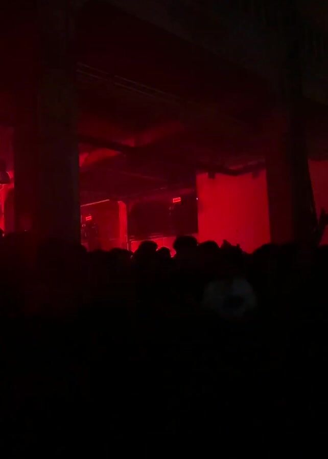 A crowd of young adults is seen from slightly below, looking toward the stage in a darkened venue. The lighting shifts between red and a lighter, cool tone, highlighting the faces of the audience members. There are a few large concrete pillars visible in the background. The crowd appears calm and attentive.