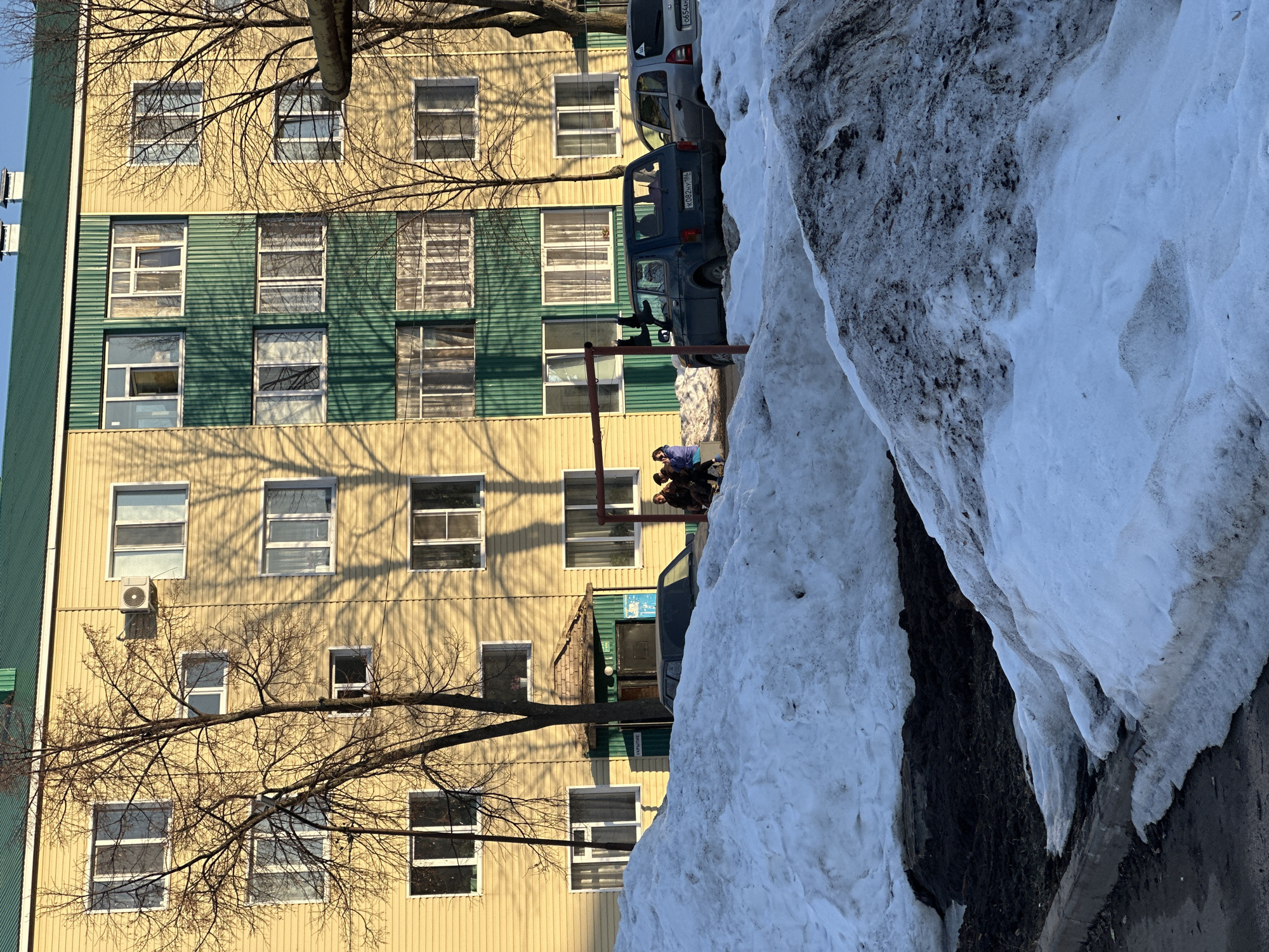 A medium shot depicts a building with alternating yellow and green horizontal paneling in Aktanysh, Russia. The building features multiple windows with white frames. A bare tree stands in front of the building, its branches casting shadows on the yellow panels. A blue car is parked in front of the building, partially obscured by a large snowdrift. A group of people are standing near the entrance of the building, but their actions are unclear. The environment suggests a cold, possibly wintery, season with remnants of snow. The overall tone is mundane, capturing an ordinary scene in the city.