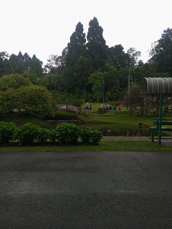 The image displays a public park or recreational area in Beni, Nepal, under an overcast sky. The foreground features a dark, wet asphalt road surface. Immediately beyond the road, a strip of green grass precedes a line of low, dense green shrubs. Behind these shrubs, a tranquil pond with reflections is visible. A small, light-colored arch bridge spans a narrow section of the pond on the left. On the grassy bank across the pond, multiple individuals are present. A small group is situated near the bridge, with two motorcycles parked on the grass beside them. Further to the right, a larger group of people is gathered, some seated on low stone walls or benches, and others standing. A red umbrella is visible among this group. A tall, dark streetlamp stands upright in the midground, to the right of the park's center. To the far right, a green, arched, corrugated metal structure, possibly a shelter, is visible next to pink and purple flowering shrubs. The background is dominated by a dense, verdant expanse of trees and foliage covering hills, with two particularly tall, narrow trees prominent near the top center of the image.