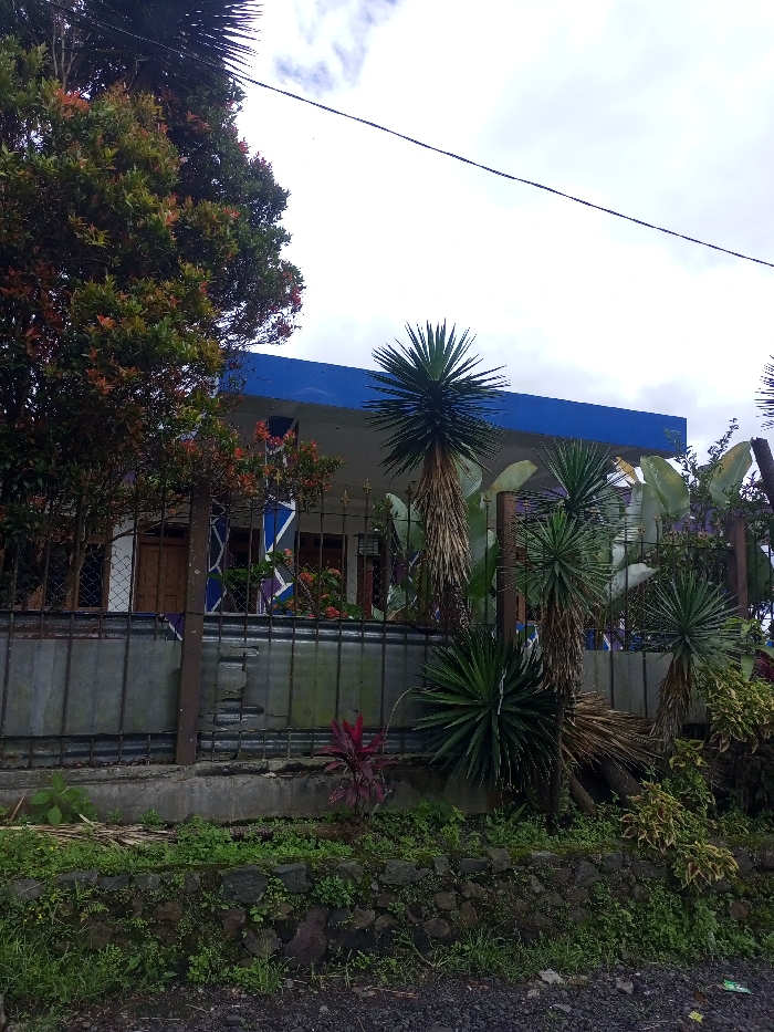 The image displays an exterior view of a residential property in Meyong, India. A single-story white house, partially obscured by dense foliage and a dark metal fence, features a prominent blue overhang. Two brown wooden doors and decorative pillars with blue and white geometric patterns are visible on the house's front. The fence consists of a lower section with corrugated metal panels and an upper section of horizontal bars, appearing weathered. The foreground presents dark, gravelly ground leading to a low stone retaining wall, which is covered in moss and various small green plants. Dominant vegetation includes a large tree with green and reddish-orange leaves on the left, and multiple tall, spiky-leaved plants resembling Yucca species, positioned in front of the house and behind the fence. Additional green and variegated plants, along with a distinct reddish-purple plant, are observed near the fence base. The scene is set under an overcast sky, with a single dark utility line stretching horizontally across the upper portion of the frame. No individuals, animals, or observable actions or interactions are present.