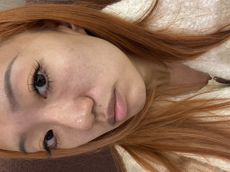 The image displays a close-up, front-facing portrait of an East Asian female in an indoor setting in Chuo, Japan. The subject has long, straight, auburn-colored hair extending over her shoulders and is wearing a cream-colored, textured garment, possibly a coat or sweater, with a small metallic fastener visible near the collarbone. Her skin is light to medium-toned, exhibiting visible pores and a subtle sheen on the forehead, nose bridge, and cheekbones. She has dark, defined eyebrows and prominent black false eyelashes on both eyes. Her dark eyes are open and directed towards the viewer. Her lips are closed, displaying a muted pinkish-purple hue, and her expression is neutral to slightly somber. The background is a uniformly dark brown blur, providing no discernible environmental details. No specific actions or interactions with other subjects or objects are depicted within the frame.