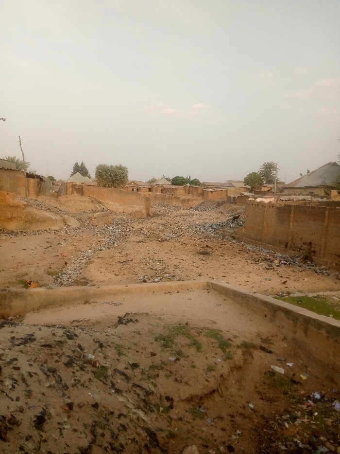 The scene depicts an open, unpaved urban area in Pantame, Nigeria, under a hazy, light-toned sky. The foreground consists primarily of reddish-brown dry soil, with a low, rectangular depression defined by concrete or masonry retaining edges. This depression contains sparse green vegetation and scattered litter. The mid-ground features a significant gully or depression filled with dark grey aggregate material (gravel/rubble) and scattered refuse. Several weathered, vertical posts or partial structures stand within this gully. The background and sides are lined with numerous single-story structures built from reddish-brown earthen blocks or concrete, exhibiting various roof types including flat, gabled, and conical designs. Vegetation includes several trees, notably a deciduous tree with light foliage in the mid-left and a palm tree on the right. A utility pole with overhead wires is present on the far left. No human presence or activity is observed.