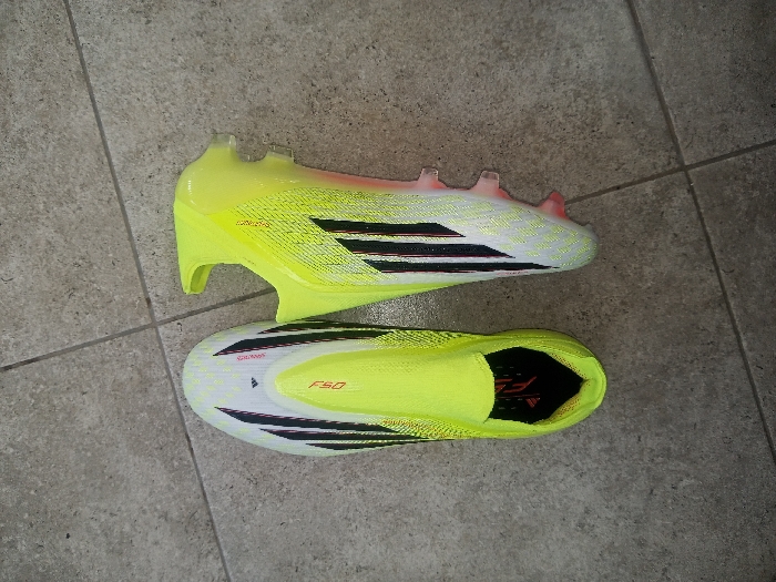 - "Two bright yellow and white Adidas F50 soccer cleats lay side by side on a gray tiled surface" by FM-leQdw1, licensed under CC BY 4.0