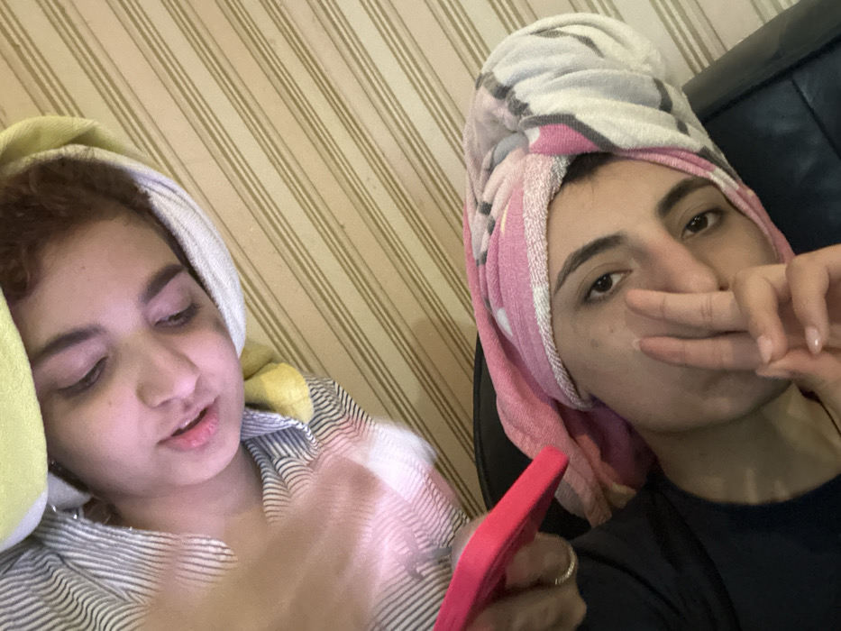 Two women pose indoors. Both wear towels on their heads, one yellow-white, the other pink-white. The woman on the left wears a striped shirt, looking downward. The woman on the right is closer to the camera, wearing a black shirt. She holds a pink phone and rests her fingers near her lips, making a gesture. The background consists of striped walls.