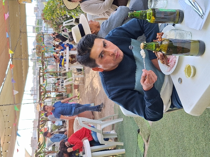 The image depicts a scene in Socabaya, Peru, located at coordinates -16.459 latitude and -71.545 longitude. The scene is set in an outdoor dining area, with a canopy overhead to provide shade. It features a group of people, some of whom are seated at tables eating and drinking. The man in the foreground is seated at a white table with a white tablecloth, eating with a fork, and holding a glass of what appears to be beer. He is wearing a dark blue sweater and a light blue shirt. On the table in front of him is a plate of food with meat, rice, and onions, a bowl of green sauce, and a glass with an amber liquid. To the right of him, another bottle of beer sits on the table. Behind him, the scene is busier with people in various stages of eating and drinking, some sitting at tables while others stand and chat. The environment is a typical outdoor dining area with tables, chairs, and foliage, all of which have been arranged to provide a comfortable and relaxing atmosphere. The overall impression is one of a lively and social gathering, with people enjoying themselves in the pleasant outdoor setting.