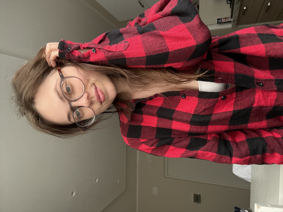 A young woman with brown hair and round glasses poses while wearing a red and black flannel shirt