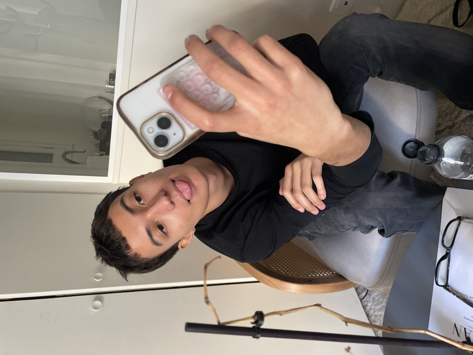 The image depicts a young male individual seated indoors, taking a selfie with a smartphone. This scene is an interior setting in Paris, France. The male has short, dark hair with a noticeable fringe and is looking directly at the phone's camera, playfully sticking out his tongue. He is wearing a black long-sleeved shirt and dark grey jeans. His left hand holds a clear-cased smartphone, identified as an iPhone model with a dual-camera setup and a light pink 'Pop It' style grip accessory affixed to the back. He is seated in a light grey upholstered armchair, featuring visible light-colored wooden or rattan elements on its right side. To his left, on a dark grey rectangular table, are black-framed eyeglasses resting on a white sheet of paper, alongside a clear plastic water bottle with a black flip-top lid, partially full of water. A dark, slender decorative object resembling dried branches or a minimalist plant sculpture is partially visible on the far left of the frame. The background consists of a light-colored wall or closed wardrobe with two circular knobs on the left, and a framed window or mirror reflecting indistinct shapes, possibly interior elements, on the right. A light-colored, textured rug is visible on the floor beneath the table and chair.