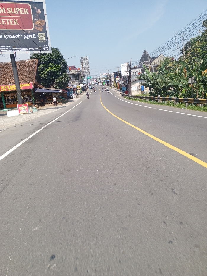 This image presents a daytime, low-angle perspective of a multi-lane asphalt road curving gently to the right. The scene is located in or near Bogor, Indonesia, as indicated by visible signage for "HM SUPER KRETEK" (an Indonesian cigarette brand) and "Oleh Khas Bogor" (Bogor's special souvenirs). On the immediate left, a large brown-bordered billboard displays the "HM SUPER KRETEK" logo, Indonesian text, and a "21+" age restriction symbol. Below it are multiple low-rise commercial structures with brown tiled roofs, featuring open fronts displaying various merchandise. One stall prominently displays "Oleh Khas Bogor." Two individuals are visible near these shops; one is standing, and another is partially obscured further back. A dense network of overhead utility wires is supported by multiple poles along this side of the road. The roadway itself is gray asphalt, marked with a solid white line along the far left shoulder and a continuous yellow line delineating the center or a lane boundary. In the midground, approximately eight motorcycles are traveling away from the viewer, predominantly on the right side of the visible road segment. Riders are discernible on most motorcycles, some wearing helmets. Several automobiles are visible further down the road. To the right of the road, a metal guardrail separates the pavement from an elevated embankment covered in lush, green vegetation, including discernible banana trees. Behind this foliage, a mix of multi-story buildings and additional utility poles with overhead wires line the street. The sky above is clear and light blue, indicating bright daylight conditions. The overall environment suggests an active commercial area.