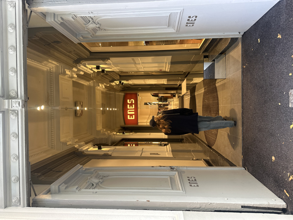 The image depicts the entrance to a retail establishment, identified as "ENES," located on Schuttershofstraat in Antwerp, Belgium. The view is from outside, looking inward through two tall, partially open, ornate white double doors. The word "ENES" is stenciled in gray on the lower panel of each door. Beyond the entrance, a long, well-lit corridor extends into the building. The corridor features a light-colored tiled floor with dark circular rugs. The ceiling is white, coffered, and adorned with decorative moldings and a series of small, downward-facing spot lights. The walls on both sides of the corridor are cream or white, featuring architectural details such as pilasters and recessed panels, with large display windows showcasing merchandise. Black, rectangular wall-mounted lights illuminate these display areas. A reflective, low display table or bench is visible on the right side of the corridor. A solitary individual, viewed from behind, is walking away from the viewer down the center of the corridor. This person has long, reddish-brown hair, wears a dark baseball cap, a dark blazer or jacket, light blue jeans, and carries a dark bag over their left shoulder. They are proceeding towards the main retail area. At the far end of the corridor, a brightly illuminated store interior is visible, featuring a prominent, red, backlit "ENES" sign. Mannequins and clothing racks are discernible within this main shopping area. The immediate exterior ground is covered with a dark gray mat or carpet, with a few scattered dry leaves visible.