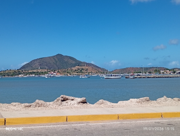 A scenic vista captures a harbor dotted with boats, reflecting a bright blue sky. A mountain looms in the background, adorned with structures near its base. The foreground features a rough, beige barrier with a distinct yellow stripe along its lower edge. The date 19/01/2026 13:15 is visible in the lower right corner, and "REDMI 14C" appears in the lower left.