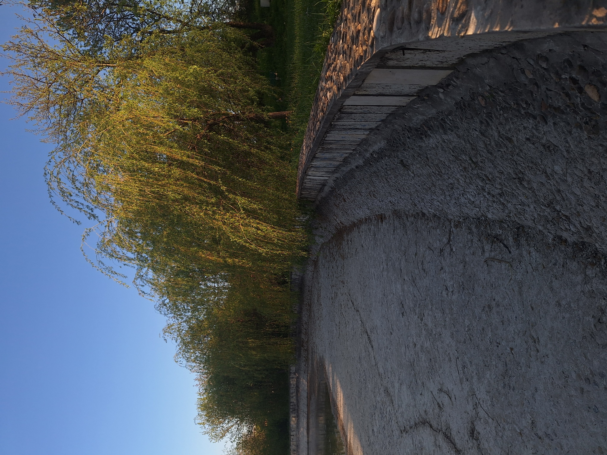 The image depicts a scene in Targovishte, Bulgaria, featuring a concrete and stone structure along a pathway. To the left of the path is a tree with hanging leaves and a clear blue sky. The concrete and stone structure has a weathered appearance. The scene appears to be outdoors in an urban park setting. There is grass in the distance.