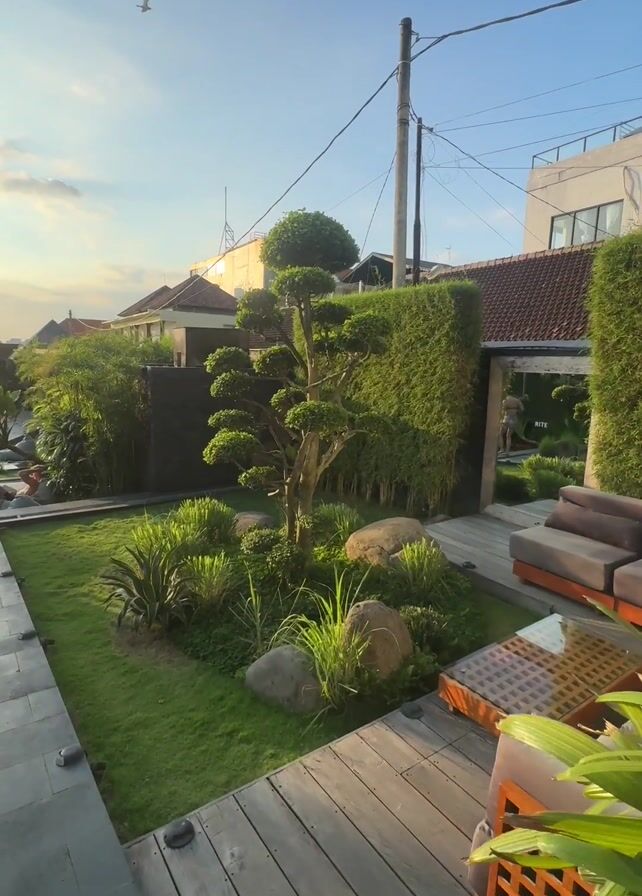 The video presents an exterior view of a landscaped garden or courtyard, likely in a tropical or subtropical region given the vegetation. The area is primarily green, featuring manicured lawns, a variety of plants, and a pruned tree centrally located within the frame. The landscaping includes rocks or boulders placed amongst the foliage. There is a paved pathway made of large, rectangular stones that leads through the courtyard. To one side, there is a wooden deck or platform with outdoor furniture, including a low table and cushioned seating. In the background, there are buildings including structures with red-tiled roofs and other buildings with lighter colored walls. Overhead, power lines are visible against the blue sky with the sun shining brightly. Two people are visible. One is walking away from the camera along the stone pathway. The other is lying on a lounger in the sun.