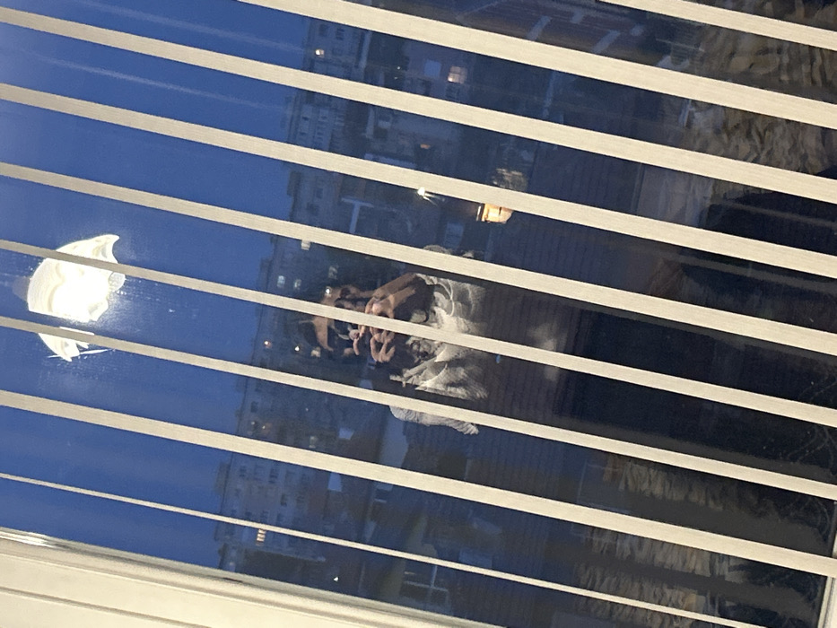 The image displays a composite view through a window in the city of Pazardzhik, Bulgaria, during twilight or night conditions. White vertical blinds, oriented diagonally from top-left to bottom-right, partially obscure the scene. A person, whose upper torso and head are reflected in the window's glass, is positioned centrally within the frame. This individual, wearing a light-colored, possibly patterned, upper garment and dark lower attire, holds a smartphone with both hands, pointing it towards the viewer, indicative of capturing a self-portrait. Reflected above the person's head is an illuminated ceiling fixture with a white, ruffled shade. A secondary, smaller, warm light source is faintly reflected to the person's right. Beyond the reflection and the blinds, the exterior environment features a dark blue sky above an urban landscape. Multiple multi-story residential buildings, with interior lights visible in their windows, are silhouetted against the sky in the middle distance. Darker, tiled rooftops of closer structures are discernible beneath the distant buildings.