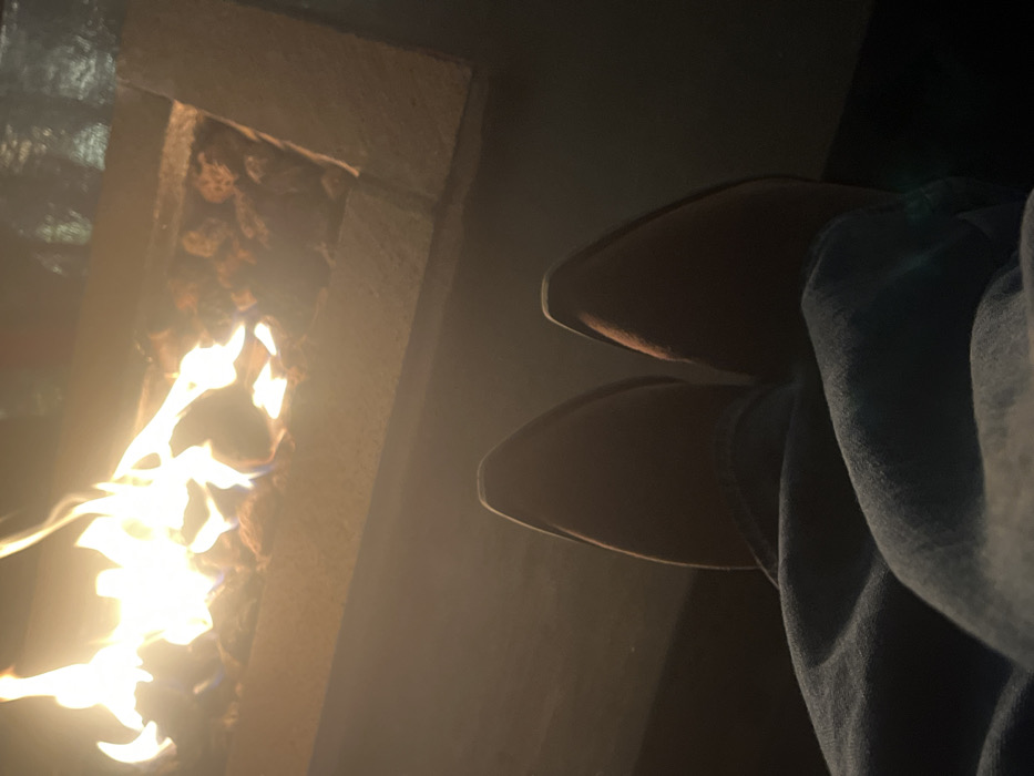 The image presents a low-angle, first-person perspective depicting a person's lower legs and feet situated in front of a lit fire pit