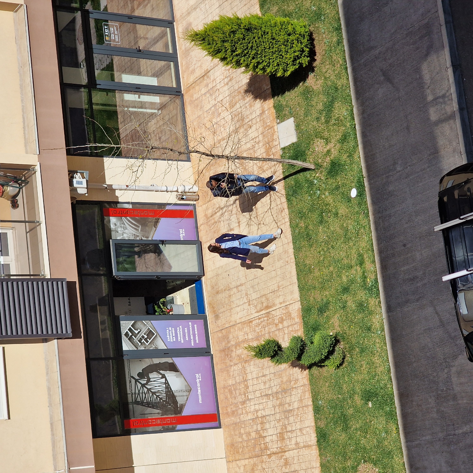 n aerial view of a street scene in Podgorica, Montenegro, featuring a building, people, greenery, and a car. The building has large glass windows displaying company names and services, including "montecontrol" and "DICT." There are two people walking on a brick-paved area between the building and a grassy area with trees and bushes. A black car is parked on the adjacent street. The scene appears to be taken from a high vantage point, likely from an upper floor of a building.