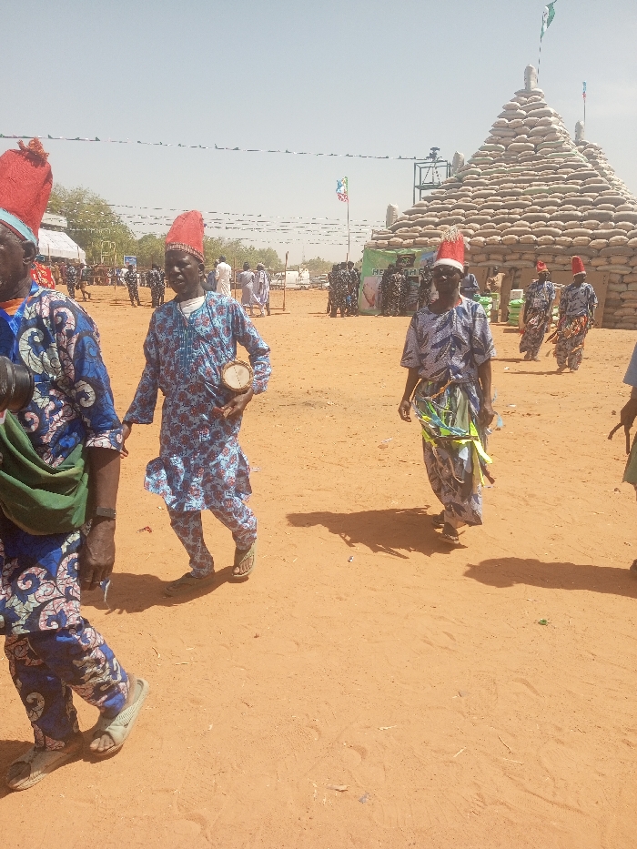 The image portrays an outdoor gathering in Kokani North, Nigeria, under a clear, bright sky, with a reddish-brown sandy ground. In the foreground, multiple individuals walk from left to right. The leftmost person, partially visible, wears a blue patterned tunic and trousers with a green fabric slung over their shoulder. The central figure wears a light blue patterned tunic and trousers, a red conical hat, and holds a small, round, light-colored drum in their left hand. Another prominent figure to the right wears a blue and white patterned tunic, a multi-colored fabric sash around the waist, dark sunglasses, and a red conical hat. In the mid-ground, to the right, a large pyramidal structure is visible, constructed from numerous stacked light-colored sacks and topped with a green and white flag. To its left, a green structure or tent with partially visible text "HEPHA" is present, near which several figures, some appearing uniformed, are gathered. Further in the background, more individuals are dispersed across the sandy area, some wearing traditional attire, including red conical hats, while others wear white robes or casual clothing. Strings with small decorations are strung horizontally across the upper portion of the frame. Strong sunlight casts distinct shadows on the ground.