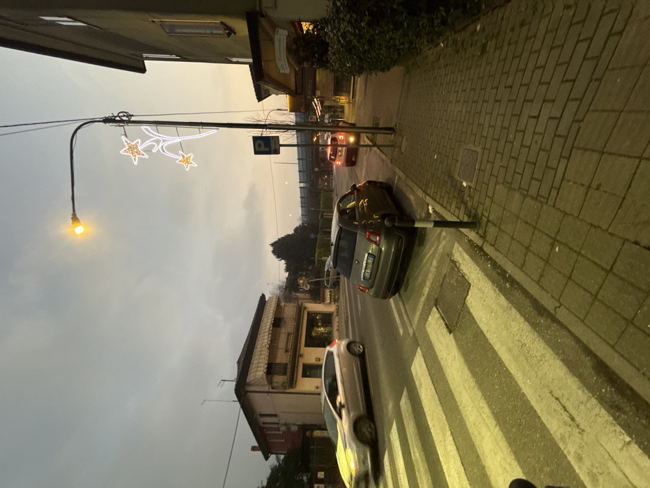 The image displays an urban street scene at dusk or early evening in Venice, Italy. A paved road with a prominent white-striped pedestrian crossing occupies the lower left and central foreground. On the immediate right, a brick-patterned sidewalk runs parallel to the road. A dark grey Fiat 500 hatchback (Italian license plate CA 309 LD) is stationary, angled with its rear left wheel on a slight incline connecting to the sidewalk. A silver or light-colored hatchback, likely a Ford Fiesta, is captured in motion on the road, traveling leftward, indicated by light trails from its illuminated headlights. Further down the road, the red taillights of another vehicle are visible. A metal streetlight pole stands on the right side of the road, emitting a yellow-orange light and featuring white, illuminated star-shaped festive decorations. Below the light fixture, a blue square sign indicating "P" for parking is affixed. On the left side of the street, a two-story building with a light-colored facade and red-painted sections features a balcony with a striped awning and ground-floor storefront windows. On the far right, a building with a greenish-grey exterior houses a ground-level establishment with an awning, bordered by well-maintained green hedges. The sky is overcast, transitioning from a light grey-blue at the top to a warm orange-yellow hue near the right horizon. In the distant background, a dark, elevated structure, consistent with a bridge or overpass, spans horizontally, with various distant lights visible beneath it. No individuals are present in the scene.