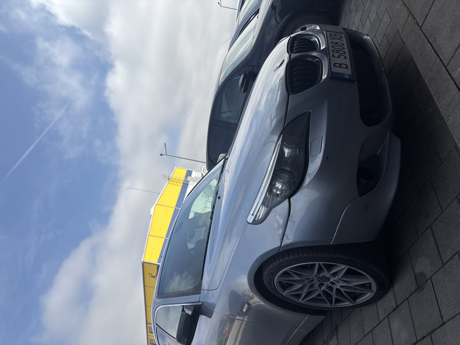 The scene is located in the city of Montana, Bulgaria, depicting an outdoor parking area under a partly cloudy blue sky. A silver BMW automobile occupies the foreground, positioned on grey interlocking concrete pavers. This vehicle is identified as a BMW 5 Series (E60/E61 generation) estate/wagon, featuring multi-spoke alloy wheels. Its front license plate displays 'B 5808 XB', indicating registration in Sofia, Bulgaria. Minor cosmetic wear, possibly dirt or scuffing, is present on the lower front bumper near the air intake. To the immediate right and partially obscured by the BMW, a dark-colored hatchback is parked. In the background, a large commercial building with a yellow upper section and a blue lower band is visible, characteristic of a Lidl supermarket. A single white contrail streaks across the upper sky. No individuals or active interactions are present in the image.