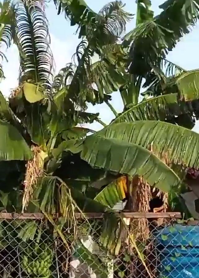 view of a chain-link fence lined with green vegetation and banana trees. Behind the fence, there is a blue container, some other objects that are somewhat obscured, and a glimpse of a white building. A young voice is heard in the background. The sky is blue with light cloud cover. The camera appears to be moving slightly, providing a more complete view of the scene.
