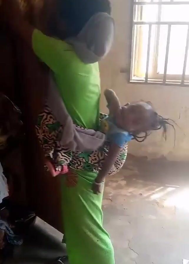 A young woman, likely in her early teens, stands indoors with a baby secured on her back using a patterned fabric sling. She's wearing a lime green dress and a gray cloth is draped over her head and shoulders. She is also wearing silver sandals. The baby, wearing a blue shirt and pink shoes, momentarily waves her arm. The woman is facing towards the left side of the frame, then turns to look towards the right. A wooden cabinet with a variety of textiles on top stands nearby. A window is visible on the right side of the frame, providing light. The room has a bare, simple look. A "TECNO SPARK" logo is visible in the lower left corner.
