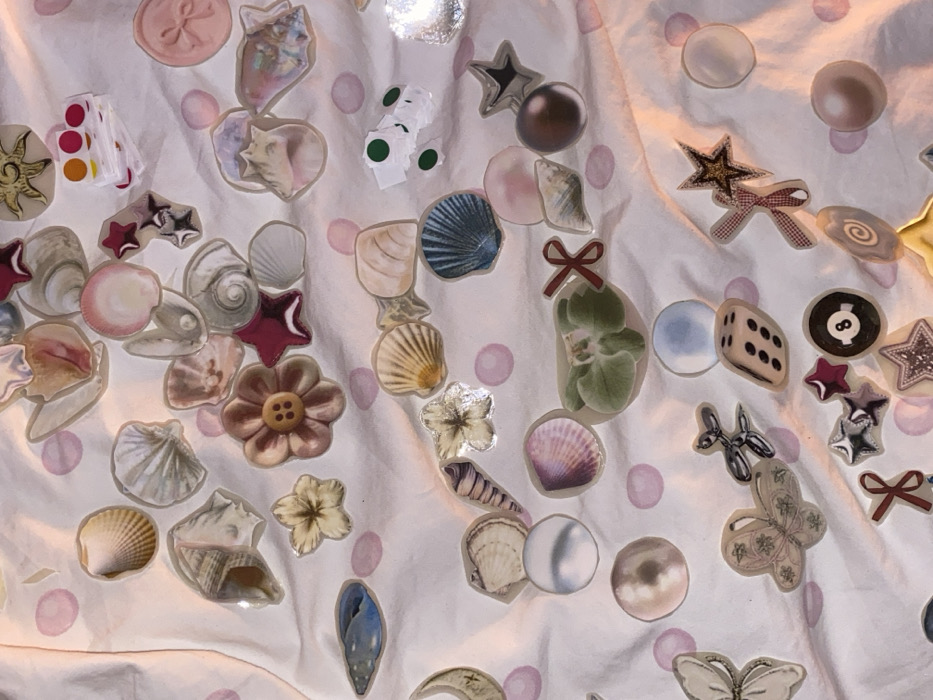 The image displays an overhead view of numerous decorative stickers or flat embellishments scattered randomly across a light-colored fabric surface