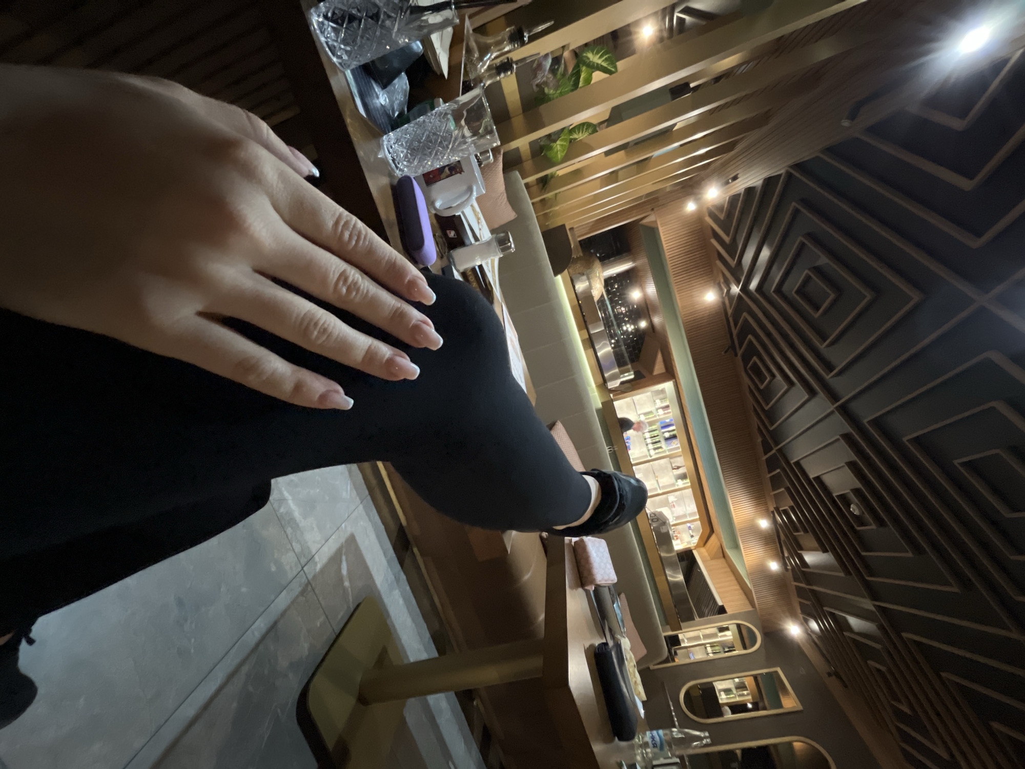 n individual seated at a table in an establishment with distinctive interior design. The person is wearing black leggings and footwear and has their hand visible on their leg. On the table, various items are present, including glasses and what appear to be personal belongings. The interior features a striking geometric ceiling pattern and appears to be in a restaurant or lounge setting. The presence of liquor bottles behind glass suggests a bar area. The location is likely within Shumen, Bulgaria, based on the prompt. No interactions or actions are readily apparent in the still image.