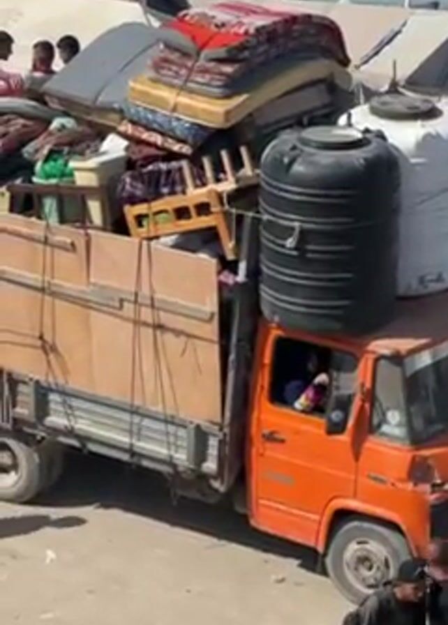 A truck overloaded with household items drives along a beach where tents are set up. Mattresses, furniture, and water tanks are stacked high on the truck's bed. Several people are sitting or standing on top of the load, while others walk nearby. The truck is orange with a silver bed and is driven by a person wearing a headscarf. The location appears to be a makeshift camp near the ocean.
