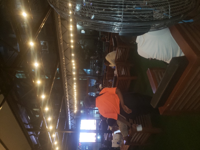 This image depicts an outdoor or semi-outdoor lounge area located in Asaba, Nigeria, observed at night
