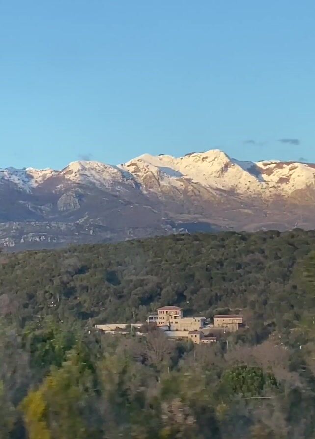 view of a snowy mountain range under a blue sky, seen from what appears to be a moving vehicle