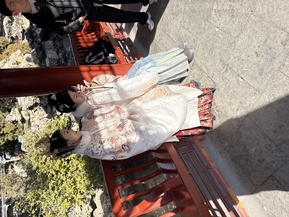 Two women in traditional Chinese attire sit side-by-side on a red railing. One woman is looking at a phone or tablet. The other woman is looking at the foliage. A man in a black jacket stands nearby, taking pictures. The location appears to be an outdoor area near a stone garden. The scene is bathed in sunlight.