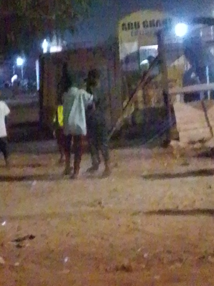In a somewhat blurred and dimly lit scene, three individuals stand near a large container-like structure. One person, seen from behind, wears a white shirt, while another has a yellow vest. The surroundings appear to be a park or open space, as indicated by the ground. A building is partially visible in the background. The overall atmosphere suggests either night or very low light conditions.