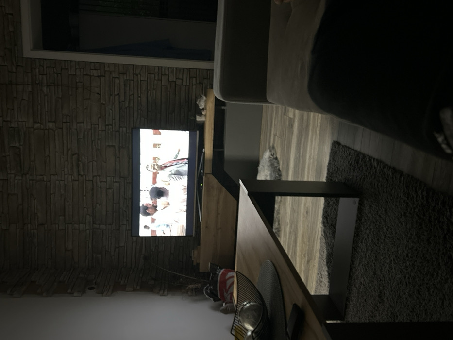 This image depicts an interior scene, likely a living room, located in the city of Lom, Bulgaria. The central focus is a flat-screen television displaying an image of three adult males, appearing to be of African descent, engaged in an outdoor conversation. The male on the right wears a light suit and red tie, gesturing with his right hand. The television rests on a modern media console constructed from wood and dark metal, situated against a wall clad in stacked, textured stone or brick veneer. To the left of this wall, a plain white wall is visible. In the foreground, a rectangular wooden coffee table with dark metal legs is present. On its surface, a dark wire bowl containing several metallic, spherical objects (possibly decorative) sits on a dark grey round placemat. A dark-colored remote control is also visible on the table. A dark grey shag rug covers a portion of the laminate wood-patterned floor beneath the table. Further back on the floor, between the coffee table and the media console, a small, light grey faux fur rug is visible. To the far left, a decorative dry plant arrangement is visible next to the media console, along with a partially obscured item featuring red and white patterns, possibly a bag or cushion. To the right of the television, on the media console, several small white objects are placed. An open doorway on the far right reveals a darker interior space, with a blue cloth hanging within. The overall lighting is dim, suggesting a low-light environment with the television screen being the primary light source. The photograph appears to be taken from a light-colored sofa or armchair, a portion of which is visible on the right side of the frame, along with a dark leg or limb resting on it.