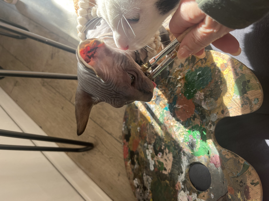 The image depicts an indoor scene in Konz, Germany, illuminated by natural light. In the foreground, a human hand holds two paintbrushes with wooden handles and metallic ferrules. A grey, wrinkled Sphynx cat is positioned to the left, extending its pink tongue to touch the bristles of one paintbrush. Its right ear is prominent, displaying a reddish interior. To the right of the Sphynx cat, a white domestic shorthair cat with a dark marking on its lower jaw is visible, its face and whiskers in close proximity to the Sphynx and the paintbrushes. Below the cats and brushes, a wooden artist's palette, heavily covered with dried, multicolored paint, rests on a dark, indistinct surface. The background features light-colored wooden floorboards, a white baseboard, and two dark, slender furniture legs, with strong sunlight casting distinct shadows.
