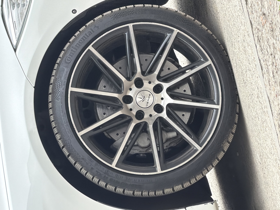 The scene, located in Pleven, Bulgaria, depicts a close-up, ground-level view of the front driver's side wheel and lower fender portion of a stationary white passenger vehicle. The tire is a Continental brand, exhibiting a winter tread pattern with vertical sipes and blocky shoulders. It is mounted on a multi-spoke alloy rim featuring a two-tone design, primarily dark grey or black with silver accents on the spokes. The center cap of the rim clearly displays the "VERDE" brand logo. Visible through the rim's spokes are a light grey or silver brake caliper and a cross-drilled brake rotor. A small, circular black sensor, likely a parking assist sensor, is present on the white fender panel above the tire. The vehicle is parked on a paved, textured concrete or asphalt surface. No individuals or specific actions are observed.