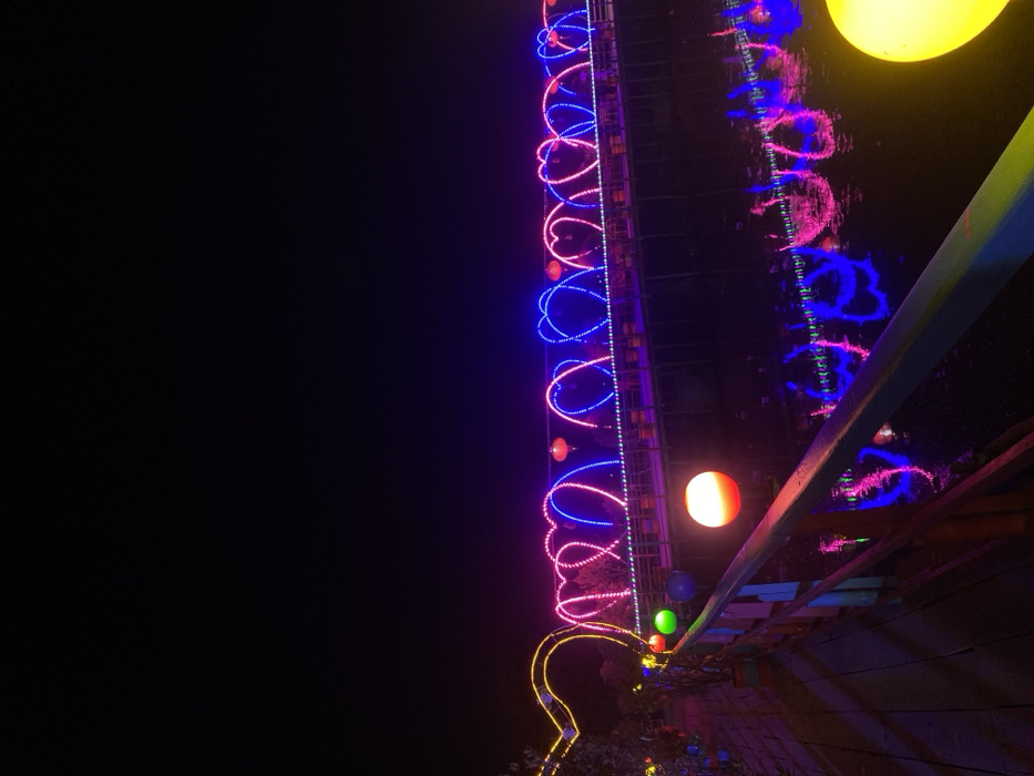 This nighttime image depicts a decorative light display over water in Dhaka, Bangladesh