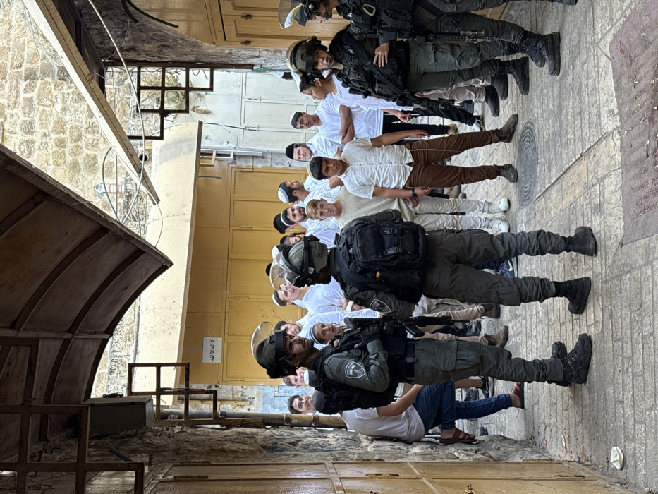 group of people, including several young men wearing white shirts and black hats, and three armed security officers, in a narrow alleyway. The alleyway is enclosed by two high stone walls, one of which is covered in a large, yellow sign. The stone walls are made of light-colored blocks and are old and weathered. The alleyway is paved with uneven stone blocks. The three security officers are standing in the middle of the image, facing a group of young men, while the young men are standing in a line and looking at the officers. The officers are wearing dark green uniforms, bulletproof vests, and black helmets, and are carrying firearms. The officers are standing in a protective posture with their hands on their weapons. The group of men are wearing white shirts and black hats, some are wearing brown pants, some black. They are standing close together, and some of them appear to be talking to each other. The scene is set in the Old City of Jerusalem, Israel, at the coordinates 31.525, 35.109.